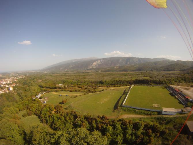 | Der Sportplatz ist zusätzlich zur weissen Mauer noch mit einem hohen Zaun umgeben. Ich bin spontan hinter dem Sportplatz (hier im Bild links) gelandet. Diese Wiese liegt unterhalb des Sportplatzes, ist völlig ohne hohe Zäune und lässt sich von beiden Seiten gut anfliegen. | | |