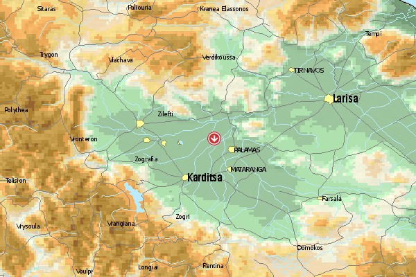 Ca. 540m hoher Berg im östlichen Bereich der Ebene von Larissa, Startmöglichkeit nach West, Süd und Ost. Landung auf den Feldern und "Wiesen" westlich von Makrochori