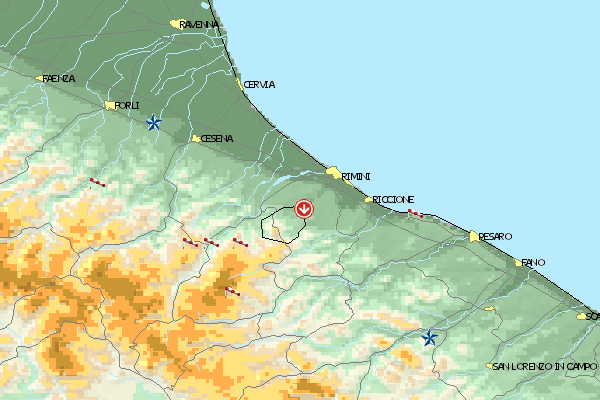 Der Standort liegt gut 60 km von Rimini entfernt. Bis zum Landeplatz beträgt der Höhenunterschied 350 m.