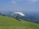 Sehr schöner Wiesenstart Richtung Süden mit kleinem Windfähnchen. Meistens Gleitflug kann jedoch bei entsprechenden Voraussetzungen auch thermisch werden.