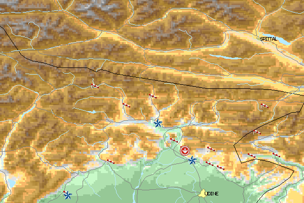 Der Landeplatz in Gemona ist gestrichelt eingezeichnet. Der Fliegertreff ist gelb eingeringelt.